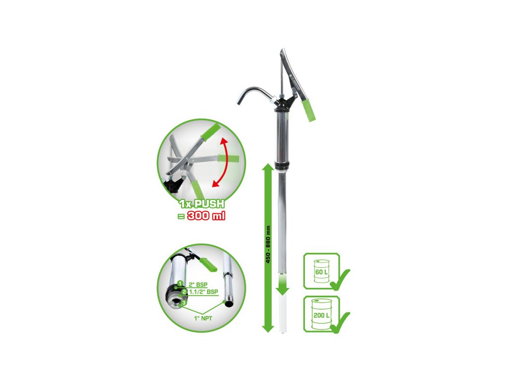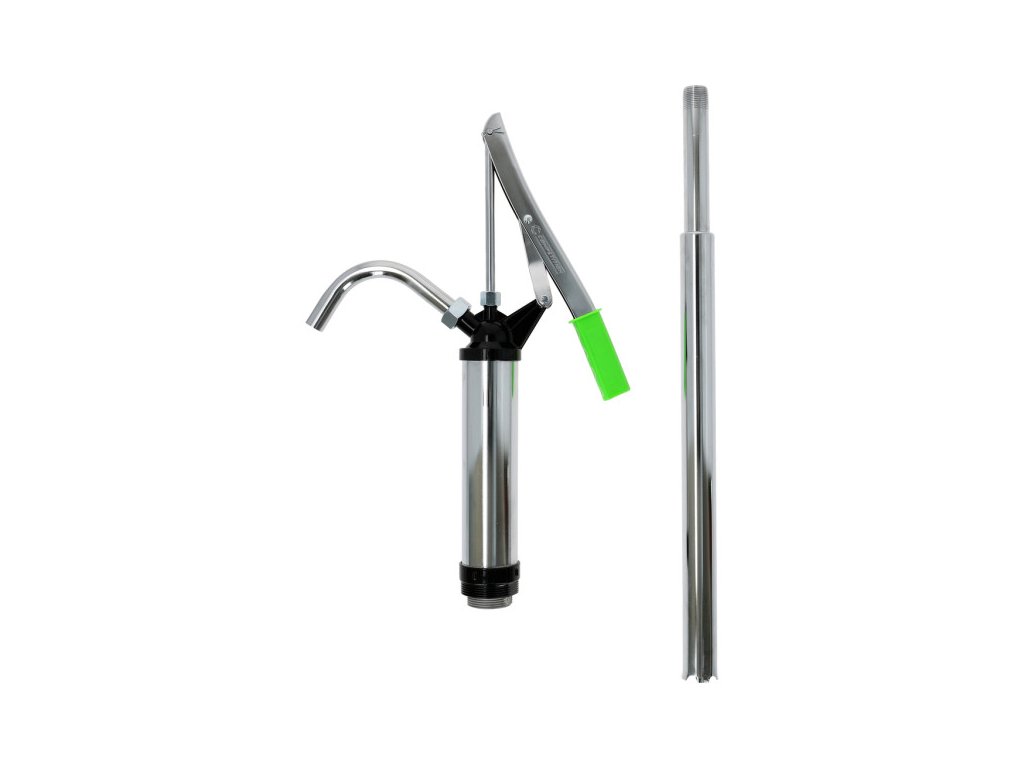 hlava čerpadla zo stabilnej zinkovej liatinyteleso pumpy z ocelevhodné pre 50 - 200 litrové sudy vďaka 2-stupňovému pripojovaciemu závituvšetky diely z ocele s pozinkovaným povrchomoceľového výtokové koleno zaistené prevlečnou maticoupre všetky oleje do SAE 90, samomazacie, neagresívne médiá ako prevodový olej, vykurovací olej, nemrznúca zmesVLASTNOSTIHmotnosť v g: 2100Materiál 1: oceľová rúraObsah obalu: 1dopravované množstvo na zdvih cm?: 300dĺžka nasávacej rúry mm: 450-860skrutkový spoj sudu: 2" BSP - 1.1/2" BSPčerpacie množstvo l/min: 16