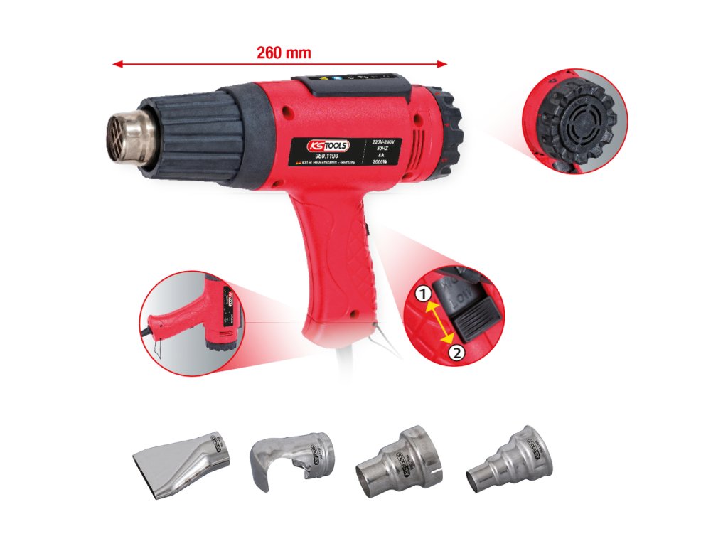 Teplovzdušná pištoľ vrát. 4 nástavcov 960.1190